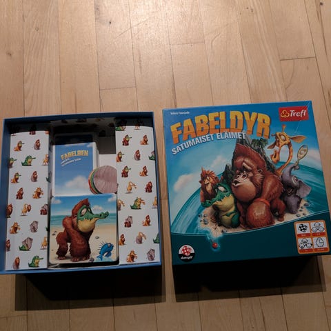 Trefl Fabeldyr brætspil. Familiespil med kort og spillebrikker, hvor spillerne skal huske og finde de rigtige fabeldyr på stranden. Spillet er illustreret med farverige fantasidyr og leveres i æske med spilleplade i låget, kort og plastbrikker. Regler på dansk er trykt på æsken.