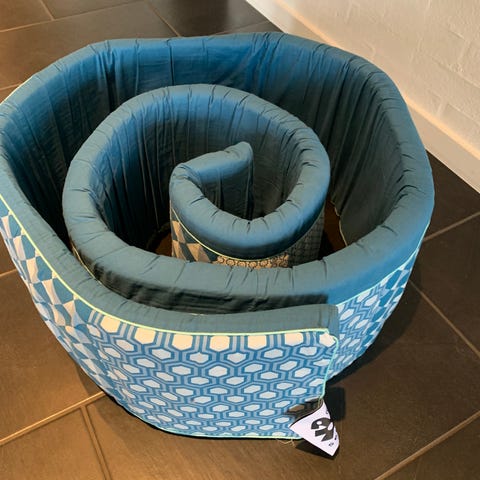 Sebra sengehest/blød sengekant i blå nuancer med geometrisk mønster. Sengekanten er polstret og kan rulles sammen for nem opbevaring. Egnet til brug i tremmeseng eller juniorseng for at skabe en blød kant langs sengens sider. Fremstillet i tekstilmateriale med blød fyldning, der giver en behagelig og afskærmende kant for barnet.