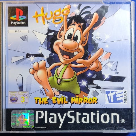 PlayStation Hugo spil. Fysisk spil på disc til den originale PlayStation-konsol. Spillet leveres i standard PlayStation-plastcover med for- og bagsidecover samt spil-cd. Egnet til brug på kompatible PlayStation-systemer, hvor man kan spille som figuren Hugo i forskellige baner og udfordringer.