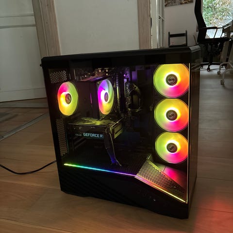 Asus stationær pc i kabinet med glas-sidepanel og RGB-belysning. Kabinettet har synlige front- og sideblæsere med lys. Velegnet som skrivebordscomputer til generel brug, gaming eller kontorarbejde afhængigt af den interne hardwarekonfiguration.