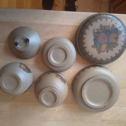 To runde stentøjsrelieffer. Dia hhv 16 og 16,5 cm. Rå og med ujævne kanter. Se billede for glasur"rids".