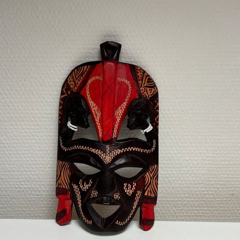 Fin lille vægmaske / maske i porcelæn / keramik med farverig dekor - til ophæng på væg som vægpynt / vægdekor.