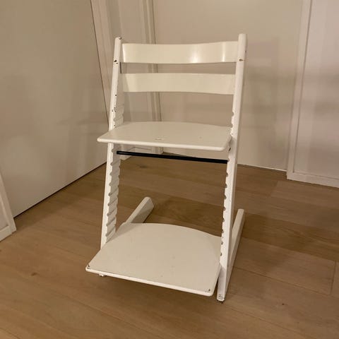Stokke højstol i træ. Justerbar sæde- og fodplade, som kan tilpasses barnets højde. Klassisk design egnet til brug ved spisebord eller som siddeplads til børn i forskellige aldre. Overfladen viser almindelige brugsspor efter daglig brug.