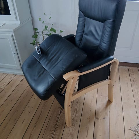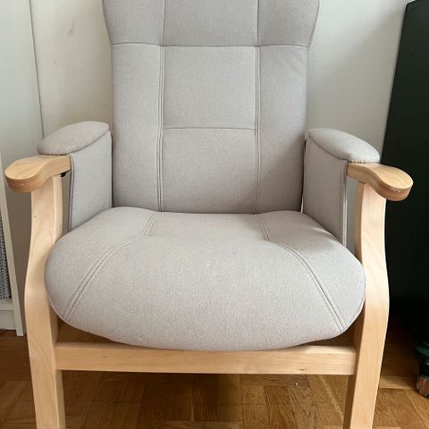 Lænestol med elektrisk sædeløft tilrettet ældre. Fjernbetjeningen er nem at overskue med fire knapper, som hænger på stolens kant, som styrer sædeløft og stolens ryg. Den har tidligere været brugt på plejehjem.