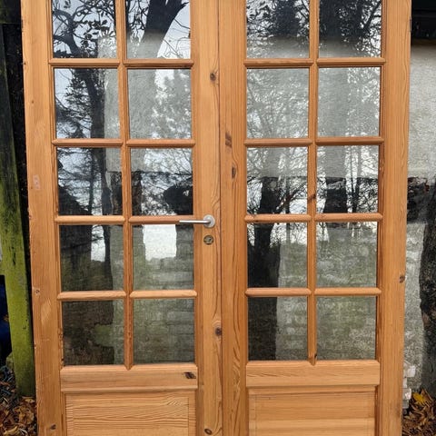 Dobbelt indvendig glasfyldningsdør i fyrretræ med klarlak. Døren består af to dørfløje med flere glasfelter i hver fløj og fyldningsfelter nederst. Træet fremstår i naturfarvet fyr med synlig årestruktur. Døren er udstyret med indbygget låsekasse og metalgreb. Velegnet som rumadskillelse mellem opholdsrum, hvor der ønskes lysgennemgang og visuel kontakt mellem rummene.