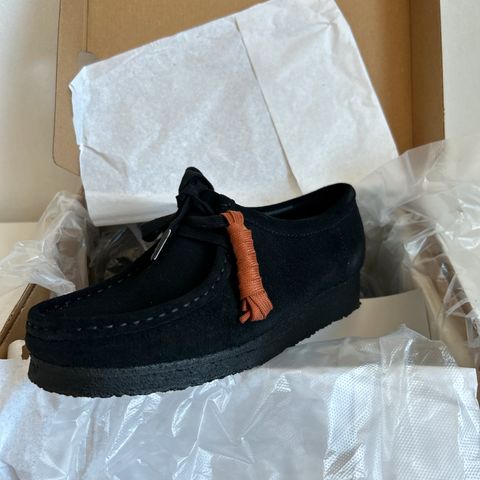 Clarks Wallabee i str. 39. Skoene er i sort ruskind med snørelukning foran. Leveres i original Clarks Originals skotøjsæske, som vist på billederne. Velegnet som hverdagssko eller pæne fritidssko.