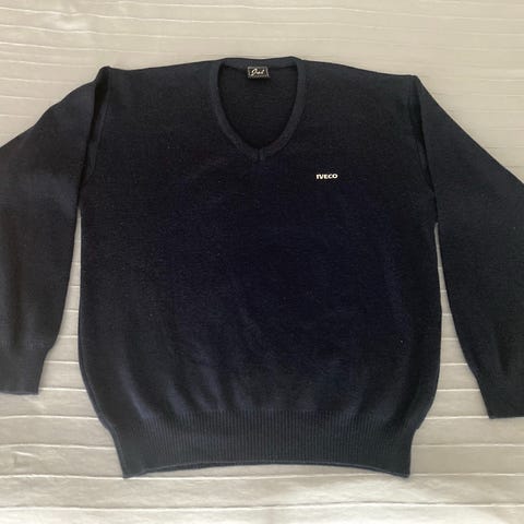 Sweater m. logo (IVECO). Farven er råhvid m. effektstriber og detaljer på skulder og albue. Der står XXL i blusen, men jeg synes , at det må være en L.