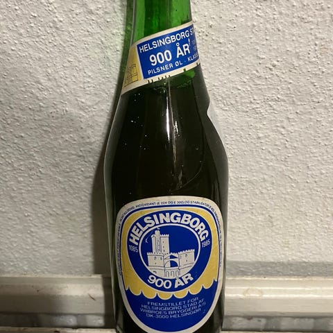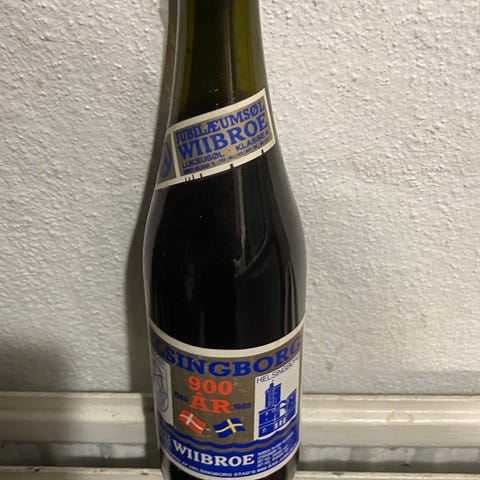 Wiibroe Helsingborg 900 år jubilæumsøl flaskeøl. Øllet er tappet på glasflaske med specialetiket, der markerer Helsingborgs 900 års jubilæum i 1985, med motiver fra Helsingborg og Helsingør samt danske og svenske flag. Velegnet som samlerobjekt eller til udstilling for interesserede i bryggerihistorie og lokale jubilæer. Har aldrig været åben