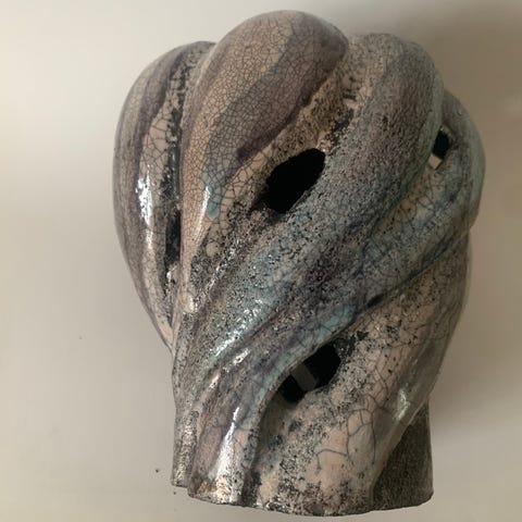Skulptur i rødler med mørkegrøn glasur, eget arbejde fra 2005. Måler H: 17,5 cm, B: 11 cm, vejer ca. 650 g