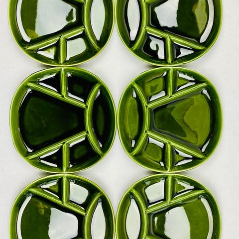 Sjældent sæt af 6 Gien opdeler-tallerkener – Frankrig – 60'erne/70'erne – midcentury-luksus i senneps- og olivengrønne nuancer