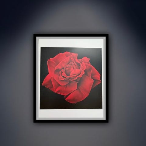 De rosenkolllektioner af Franco Campana indeholder betagende kunstprints, der fanger den delikate skønhed af en blomstrende rose i detaljer. Med sine varme nuancer og bløde, fløjlsagtige blomsterblade udstråler dette værk elegance og tidløs charme. Det rige kontrast mod den mørke baggrund forstærker den lysende glød fra rosen.