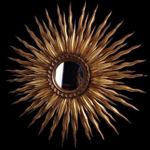 Deknudt, Belgien, Miroir soleil triptyque Edition 1971 – Light!, lavet af resin, gylden farve, tre sammenklappelige paneler, 81 cm bred, 13 cm dyb, centralt spejl let konveks, med pære. Klik på den blå "gå til varen" knap, for at købe eller byde på denne vare. Den samlede pris vil blive vist inden du afgiver dit bud.