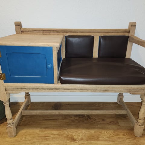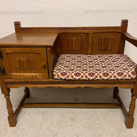Phone Bank trætelefonstol fra Europa, dateret 1940–1950, i god stand med beskedne brugsspor og pletter, læderpolstret sæde og vedlagt lille bord med skuffe, mål 86 x 96 x 41 cm. Klik på den blå "gå til varen" knap, for at købe eller byde på denne vare. Den samlede pris vil blive vist inden du afgiver dit bud.
