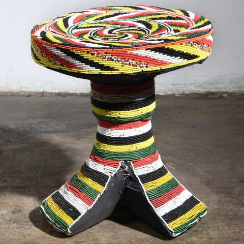 Bamileke-figur med perler. Træ dækket af stof, hvor tråde sys fast med farvede glasperler ('Trade beads'), der danner motivet. Disse figurer udgjorde en del af notabilitetens udstyr/symbolik til status, både på grund af deres fremstillingsværdi og på grund af perlernes intrinsiske værdi; de var bogstaveligt talt penge. Endnu i dag, i de sædvanlige forhandlinger, er det nemmere at sænke prisen på en simpel træfigur end på en sæk perler, som efter deres vægt har en næsten uforanderlig værdi. Højde: 28 cm.