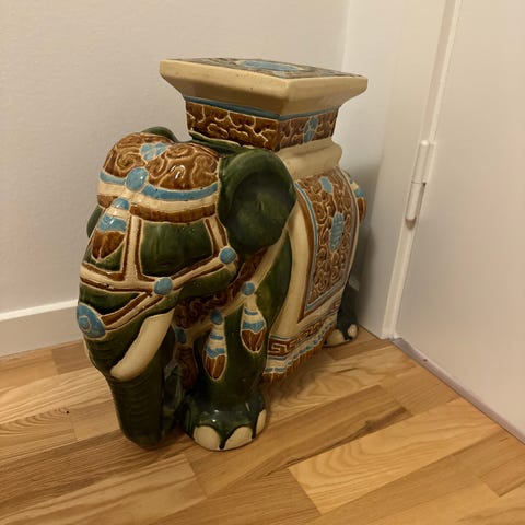 Indisk keramisk elefant urtepotteholder fra det tyvende århundrede, ikke underskrevet, i fremragende stand, mål 31 cm bred, 28 cm høj og 15 cm dyb. Klik på den blå "gå til varen" knap, for at købe eller byde på denne vare. Den samlede pris vil blive vist inden du afgiver dit bud.