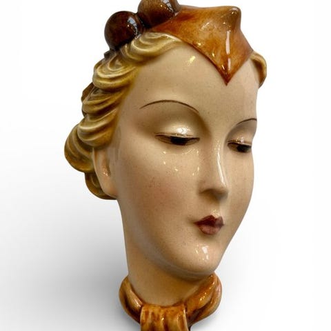 Vægmaske Goldscheider fra Tyskland, terrakotta keramik, 24 cm høj, 18 cm bred, 9 cm dyb, i Art Deco-stil med en kvindelig fremstilling fra 1950–1960, i næsten ny stand og delvist glasureret. Klik på den blå "gå til varen" knap, for at købe eller byde på denne vare. Den samlede pris vil blive vist inden du afgiver dit bud.
