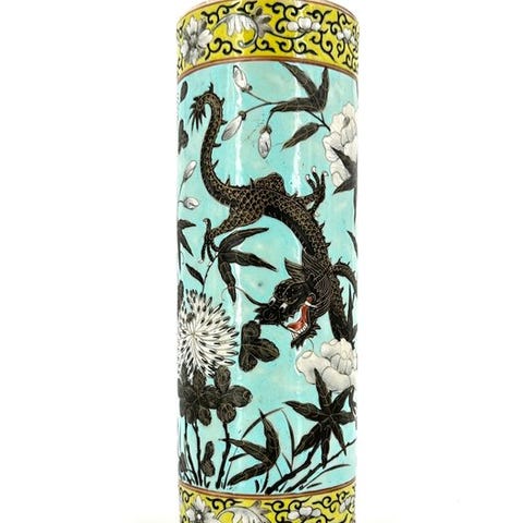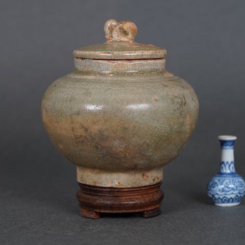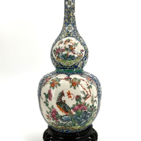 Håndmalet, farvet porcelæn dækkeskrin fra Qing-dynastiet (ca. 1850–1900), Canton-atelier, Kina; højde 13 cm, bredde 15 cm (inkl. håndtag), diameter ca. 10,5 cm; i god stand med mindre guldfarvslidt og en lille afskalning ved kanten; oprindelse privat samling; UV-kontrolleret. Klik på den blå "gå til varen" knap, for at købe eller byde på denne vare. Den samlede pris vil blive vist inden du afgiver dit bud.