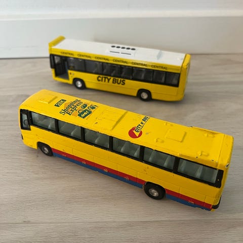 Smuk stor gammel bybus fra legetøjsmærket Rico med kablet fjernbetjening i originale æsker fremstillet i Spanien i begyndelsen af 1960’erne. Bussen er helt komplet. Da jeg ikke har de rigtige batterier, kunne jeg ikke teste den, men jeg går ud fra, at den virker.