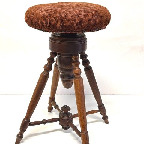 Pianostol af drejet træ med sæde i grøn ternet tekstil, højdejusterbart via en skrueaksel, ca. 1910–1920, fremstillet i Frankrig, mål 50 × 48 × 6 cm, vægt 6 kg. Klik på den blå "gå til varen" knap, for at købe eller byde på denne vare. Den samlede pris vil blive vist inden du afgiver dit bud.