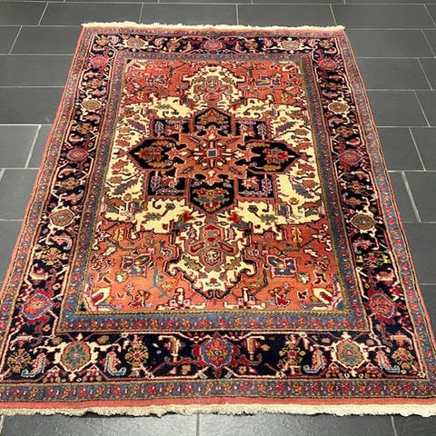 Edwardiansk chenille-tekstildug med Bokhara-mønster i persisk stil, fremstillet i Ungarn af bomuld og silkestoffer, 153 × 151 cm, ca. 2,2 kg, flerfarvet, fra midt i det 20. århundrede, professionelt renset, i generel god stand med spor af ældning og brug. Klik på den blå "gå til varen" knap, for at købe eller byde på denne vare. Den samlede pris vil blive vist inden du afgiver dit bud.