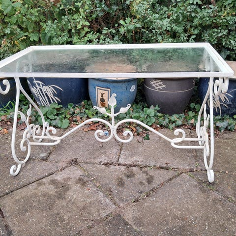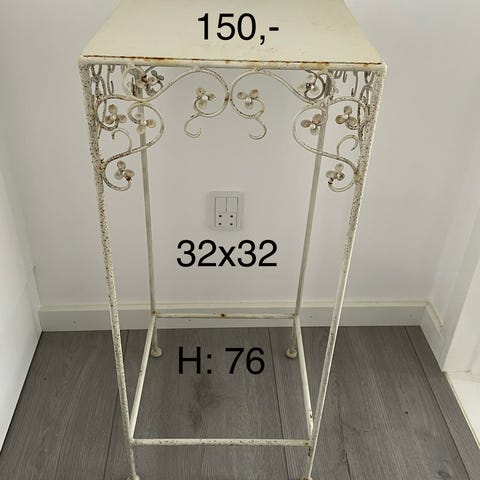 En charmerende smedet jern blomsterbord til have eller sofabord, 70 cm højt og 40 cm i diameter, lavet af jern og i god stand med lette alderstegn og pletter. Klik på den blå "gå til varen" knap, for at købe eller byde på denne vare. Den samlede pris vil blive vist inden du afgiver dit bud.