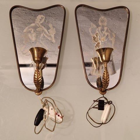 Sæt af fem væglysestager i støbt metal af håndværksproduktion, hver med et tre- arms kandelaberdesign til E14-lyskilder, måler 68 cm i højden, 30 cm i bredden og 20 cm i dybden, vægt 3 kg hver, fra Italien og dateret omkring 1950–1960, i god brugt stand med mindre aldersmærker; ledningerne bør opdateres, og der kan være behov for mindre fastgørelsesreparationer. Klik på den blå "gå til varen" knap, for at købe eller byde på denne vare. Den samlede pris vil blive vist inden du afgiver dit bud.