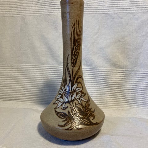 Raymonde Leduc keramisk vase med firkantet tværsnit og herbarium-dekor, lavet i Vallauris, Frankrig, ca. 1960–1970, keramik (grès) med vegetativt tryk og jordfarvet patina, højde 20 cm, bredde 8 cm, dybde 8 cm, vægt 2 kg, i god brugt stand med mindre aldersmærker. Klik på den blå "gå til varen" knap, for at købe eller byde på denne vare. Den samlede pris vil blive vist inden du afgiver dit bud.