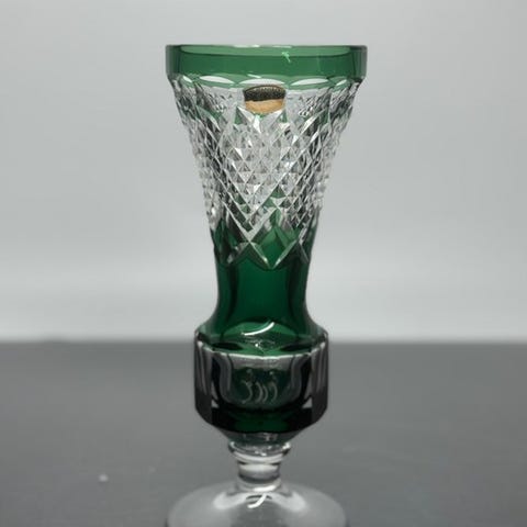 Dette elegante stykke har en klassisk udformning med en bredt facetteret krave i diamantspidser, en konisk krop prydet af dybe korsformede facetter og en rund fod. Lag af intens rubinrødt krystal, udskåret for at fremhæve geometriske mønstre i klart krystal, giver en slående kontrast og en bemærkelsesværdig glans.