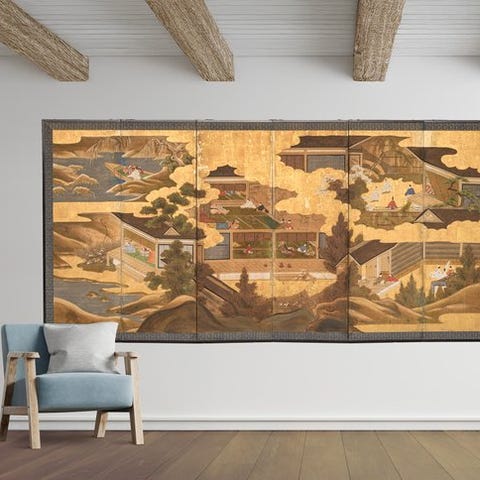 En forfinet mellemstor seks-panelers byôbu, der viser en klassisk efterårsdomstolscene fra kapitel 7 af The Tale of Genji, med titlen Momiji no Ga (Høstløvets Fest).