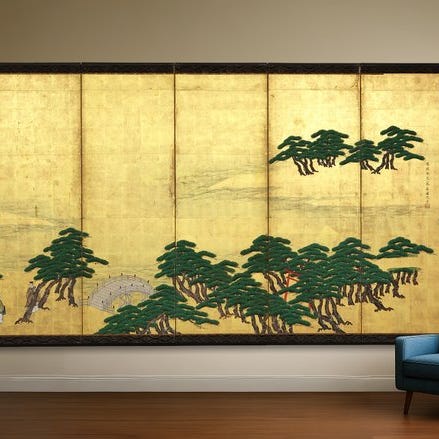 Et iøjnefaldende højt seks-panelers byôbu 屏風 (foldeskærm) med et livligt sumi-e 墨絵 (sort blæk) maleri med fokus på et imponerende, buet fyrretræ 松 (matsu).