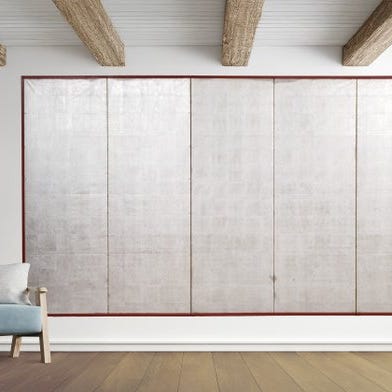 Et iøjnefaldende mellemstor seks-panelers byôbu (屏風) foldeskærm med ni velkendte faksimile-træsnits af flere berømte kunstnere, sat på en baggrund af sølvblad. Ukiyo-e 浮世絵 (træsnit) er billeder af smukke kvinder og skuespillere.