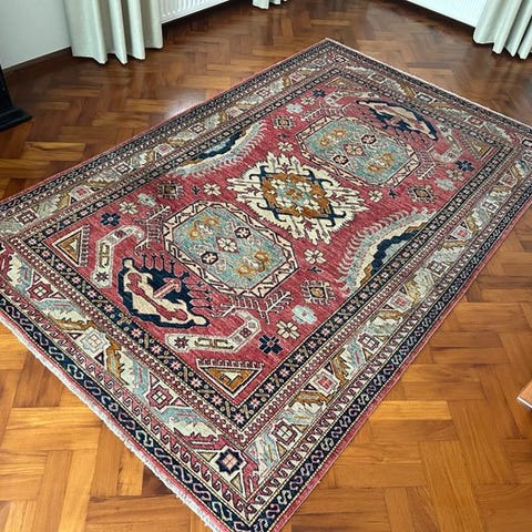 Håndvævet Ziegler Kazak måtte fra Pakistan i flerfarvet, uld på bomuld, 174 cm x 118 cm, i meget god stand og professionelt renset. Klik på den blå "gå til varen" knap, for at købe eller byde på denne vare. Den samlede pris vil blive vist inden du afgiver dit bud.