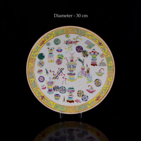 Et raffineret par af tallerkener i kinesisk porcelæn, Famiglia Rosa, fra midten af det 18. århundrede (Yongzheng-perioden, første halvdel af det 18. århundrede). Disse eksemplarer er et eksempel på den fornemme produktion beregnet til eksport til Europa, præget af en overlegen materialekvalitet og en omhyggelig udsmykning.