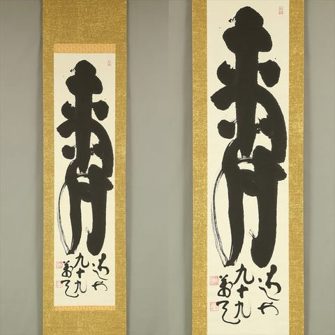 En kakejiku fra Shōwa 50 (1975) af Hasegawa Bugaku, der viser en streng Daruma med fuldmåne, underskrevet og seglet og monteret på silke med hvidt polymer jikusaki; billedstørrelse 107,5 × 41,5 cm, rulle 191 × 60 cm, i fremragende stand. Klik på den blå "gå til varen" knap, for at købe eller byde på denne vare. Den samlede pris vil blive vist inden du afgiver dit bud.