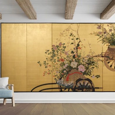 Et smukt mellemstort seks-panelers byôbu 屏風 (foldeskærm) malet med en frodig blomsterhave, sat mod en guldsølvbladgrund, der har udviklet en attraktiv aldringspatina.