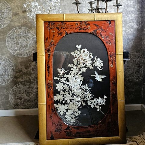Vintage Fukusa af ren silke brokade fra Shōwa-perioden med motivet Tsuru-Kame (fugl og skilpadde) og Kiri-heraldry på bagsiden, silke brocade med metaliske tråde ca. 5 mm tyk, i meget god stand med original æske fra Japan, målene ca. 56 × 51 cm. Klik på den blå "gå til varen" knap, for at købe eller byde på denne vare. Den samlede pris vil blive vist inden du afgiver dit bud.