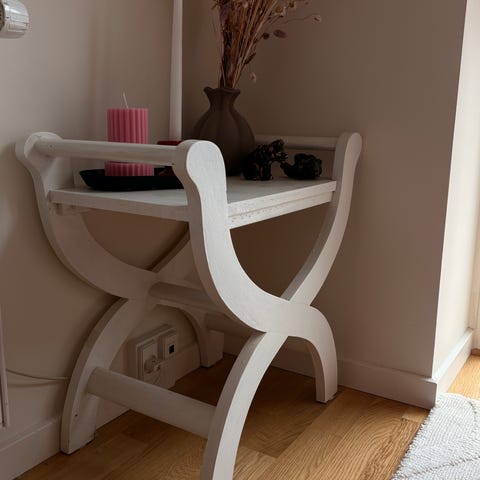 En vintage træsidebord i fransk design, lavet i Frankrig, brun farve, 66 cm høj, topdiameter 39 cm, basdiameter 34 cm, i god stand med små aldersmærker. Klik på den blå "gå til varen" knap, for at købe eller byde på denne vare. Den samlede pris vil blive vist inden du afgiver dit bud.