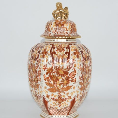 Høje gulvvasen fra Persia-serien af Royal Zuid-Holland Gouda, Nederland, dateret ca. 1950–1960, fremstillet af fayence-keramik med håndmalet guldsdekoration, ca. 58 cm høj, i fremragende stand med få brugsspor. Klik på den blå "gå til varen" knap, for at købe eller byde på denne vare. Den samlede pris vil blive vist inden du afgiver dit bud.