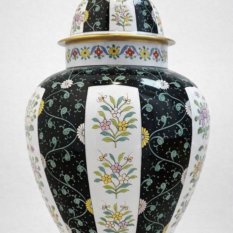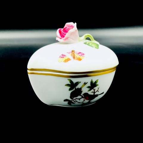 Herend Rothschild Bird porcelænsæt bestående af en stor oval plade (ca. 30 × 25 cm) og en tilsvarendeAskepotte (14 × 9 cm), håndmalet med Original Herend Hungary bundemærke, dateret til 1960’erne–1980’erne og i fremragende stand uden skår, revner eller guldbirk. Klik på den blå "gå til varen" knap, for at købe eller byde på denne vare. Den samlede pris vil blive vist inden du afgiver dit bud.