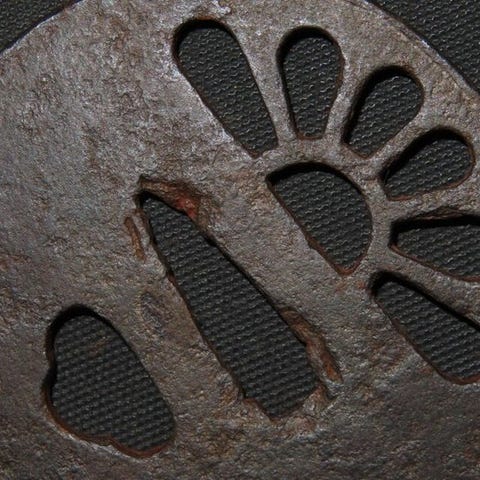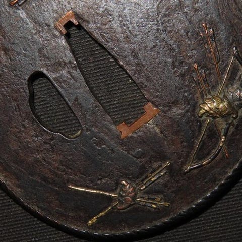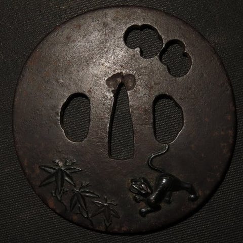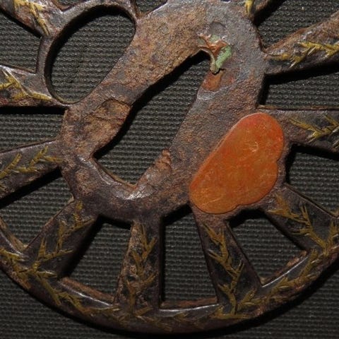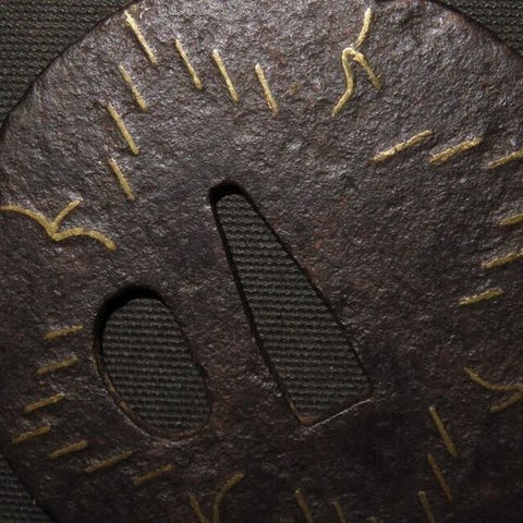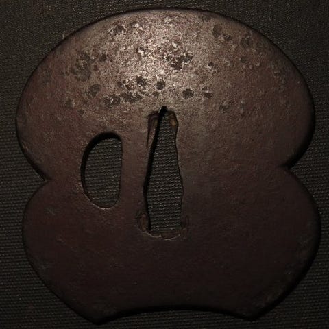 Tsuba af smedet jern fra Edo-perioden, oprindelse Japan, af Kuruma Sukashi Tsuba (C5-268), 7 cm × 7 cm × 0,4 cm, vægt 90 g, åben arbejdestil, i rimelig stand. Klik på den blå "gå til varen" knap, for at købe eller byde på denne vare. Den samlede pris vil blive vist inden du afgiver dit bud.