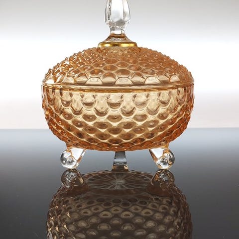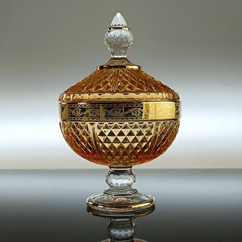 Sødskål lavet med orange emalje og guld på forgyldt glas.