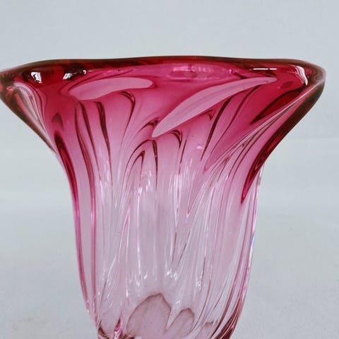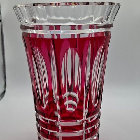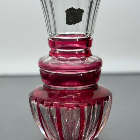 En smuk vase i rødt/gennemsigtigt krystal med højt blyindhold, underskrevet på bunden.