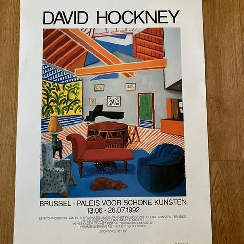 Originalplakatet for udstillingen dedikeret til David Hockney, udgivet i forbindelse med den retrospektive udstilling 'Works from the Tate Collection, 1954–2017', præsenteret på BOZAR (Bruxelles) fra den 8. oktober 2021 til den 23. januar 2022, i samarbejde med Tate i London.