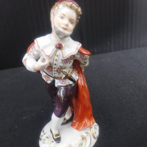 Porcelænsfigur i titlen »Charakter aus der Commedia dell'arte, der Gelehrte« fra Aelteste Volkstedter Porzellanmanufaktur, cirka 1945–1980, i art déco-stil, flerfarvet med guldkantede detaljer, dimensioner 5 x 5 x 10 cm, vægt 300 g, i fremragende stand med minimale slidmærker. Klik på den blå "gå til varen" knap, for at købe eller byde på denne vare. Den samlede pris vil blive vist inden du afgiver dit bud.