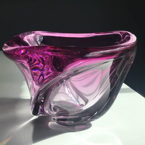 Val Saint Lambert krystal Tricorne-skål designet af Peter Muller-Munk i 1957, i Amethyst-farve, moderne Mid Century-stil, Belgien, mål 22 cm bred, 22,5 cm dyb og 9,5 cm høj, i fremragende stand og undersiden signeret. Klik på den blå "gå til varen" knap, for at købe eller byde på denne vare. Den samlede pris vil blive vist inden du afgiver dit bud.