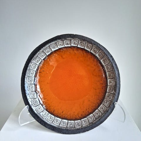 En keramisk tallerken fra Jan Nolf fra Belgien, ca. 1960–1970, med høje kanter og reliefl dekor, 30 × 30 cm og 7 cm dyb, i god brugt stand. Klik på den blå "gå til varen" knap, for at købe eller byde på denne vare. Den samlede pris vil blive vist inden du afgiver dit bud.