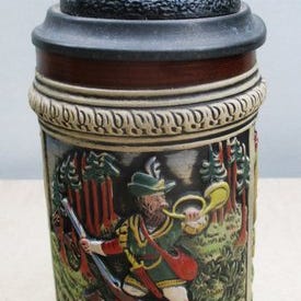 Sjældent og særligt samlerobjekt-agtigt ensemble bestående af to gamle ølbeholdere, Kanterbräu og Kongelige Porcelænsfabrik, og en original, indrammet ølreklame fra Export Van den Heuvel, dateret 1939 (Le Patriote Illustre). Et stemningsfuldt hele, der perfekt afspejler mellemkrigstiden og den europæiske ølkultur.