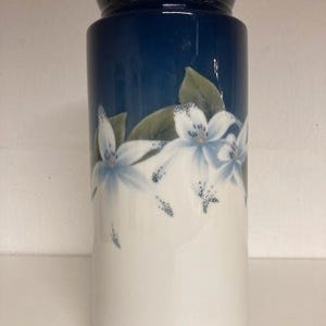 Denne elegante Royal Copenhagen-porcelænsvasen er et fremragende eksempel på klassisk dansk håndværk og tidløst design. Dens slanke, langstrakte form, det bløde farveforløb fra blå til hvid, og de smukt håndmalede blomstermotiver gør den til både et dekorativt blikfang og et samlerobjekt.