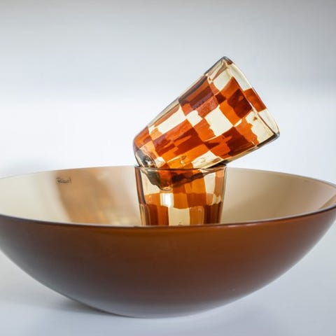 Håndlavet i mundblæst glas efter venetiansk tradition, udtrykker dette stykke Ribes' samtidsudtryk gennem enkle former og dybe farver.
