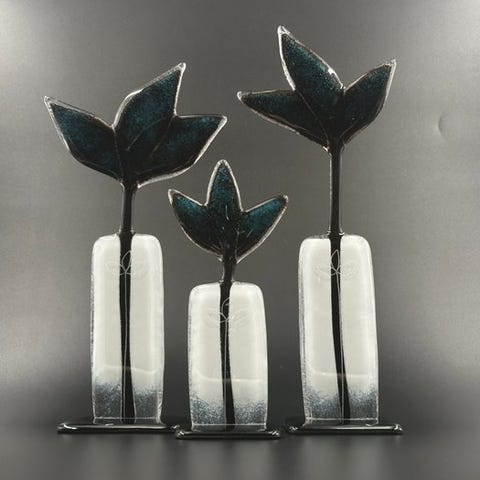 To glas valmuefrø blomster håndlavet i en smeltningsteknik af Maciej Habrat, en polsk kunstner, der har arbejdet med glas i over 20 år. Klar og opalglas smeltes sammen for at skabe disse moderne, ekstraordinære former. Glas solsikker er fremragende værker, og de vil helt sikkert tiltrække seerens opmærksomhed med deres livlige, distinkte finish og røde farve. Dimensioner: højde - 22 cm, bredde - 11 cm, dybde - 5,5 cm; Emballage: de leveres i elegante gaveæsker. Et certifikat for ægthed er vedlagt